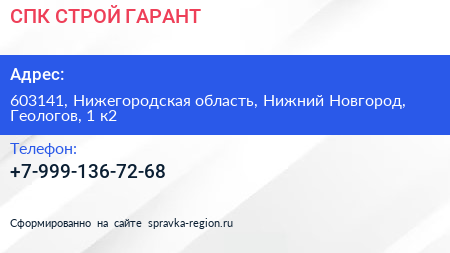 СПК-СТРОЙ ГАРАНТ по адресу 603141, Нижегородская область, Нижний Новгород, Геологов, 1 к2 в дальнейшем Организация, размещена в следующих категориях: