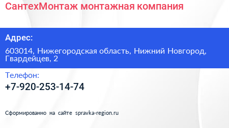 СантехМонтаж, монтажная компания по адресу 603014, Нижегородская область, Нижний Новгород, Гвардейцев, 2 в дальнейшем Организация, размещена в следующих категориях:
