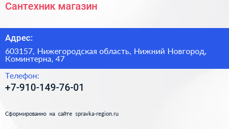 Сантехник, магазин по адресу 603157, Нижегородская область, Нижний Новгород, Коминтерна, 47 в дальнейшем Организация, размещена в следующих категориях: