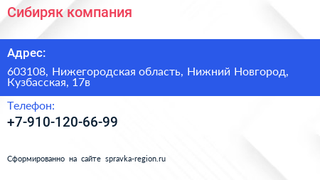 Сибиряк, компания по адресу 603108, Нижегородская область, Нижний Новгород, Кузбасская, 17в в дальнейшем Организация, размещена в следующих категориях: