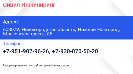 Сивил Инжиниринг по адресу 603079, Нижегородская область, Нижний Новгород, Московское шоссе, 85 в дальнейшем Организация, размещена в следующих категориях: