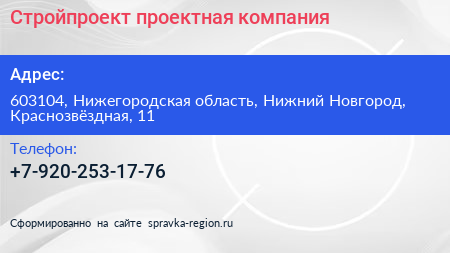 Стройпроект, проектная компания по адресу 603104, Нижегородская область, Нижний Новгород, Краснозвёздная, 11 в дальнейшем Организация, размещена в следующих категориях: