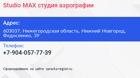 Studio MAX, студия аэрографии по адресу 603037, Нижегородская область, Нижний Новгород, Федосеенко, 39 в дальнейшем Организация, размещена в следующих категориях: