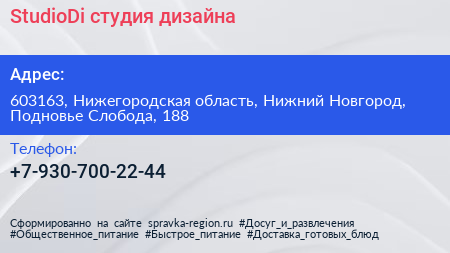 StudioDi, студия дизайна по адресу 603163, Нижегородская область, Нижний Новгород, Подновье Слобода, 188 в дальнейшем Организация, размещена в следующих категориях:
