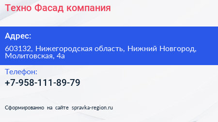Техно Фасад, компания по адресу 603132, Нижегородская область, Нижний Новгород, Молитовская, 4а в дальнейшем Организация, размещена в следующих категориях: