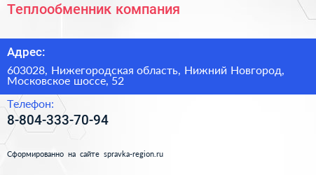 Теплообменник, компания по адресу 603028, Нижегородская область, Нижний Новгород, Московское шоссе, 52 в дальнейшем Организация, размещена в следующих категориях: