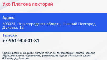 Ухо Платона, лекторий по адресу 603024, Нижегородская область, Нижний Новгород, Дунаева, 12 в дальнейшем Организация, размещена в следующих категориях:
