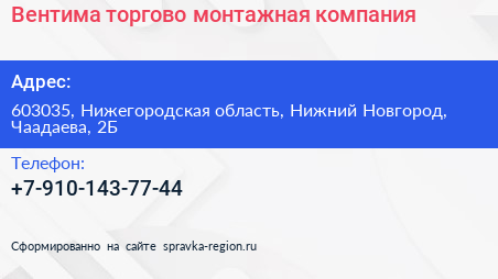 Вентима, торгово-монтажная компания по адресу 603035, Нижегородская область, Нижний Новгород, Чаадаева, 2Б в дальнейшем Организация, размещена в следующих категориях: