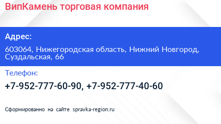 ВипКамень, торговая компания по адресу 603064, Нижегородская область, Нижний Новгород, Суздальская, 66 в дальнейшем Организация, размещена в следующих категориях: