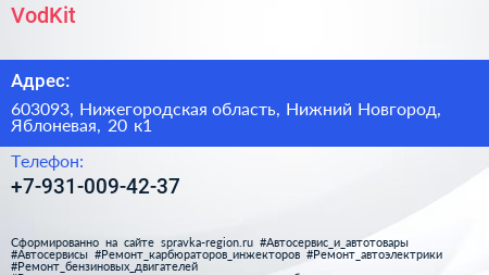 VodKit по адресу 603093, Нижегородская область, Нижний Новгород, Яблоневая, 20 к1 в дальнейшем Организация, размещена в следующих категориях: