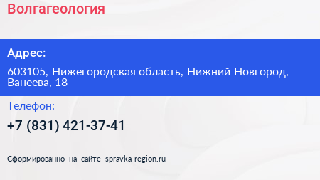 Волгагеология по адресу 603105, Нижегородская область, Нижний Новгород, Ванеева, 18 в дальнейшем Организация, размещена в следующих категориях: