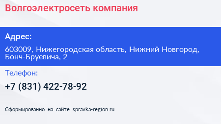 Волгоэлектросеть, компания по адресу 603009, Нижегородская область, Нижний Новгород, Бонч-Бруевича, 2 в дальнейшем Организация, размещена в следующих категориях: