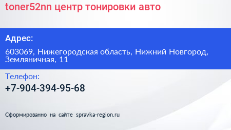 #toner52nn, центр тонировки авто по адресу 603069, Нижегородская область, Нижний Новгород, Земляничная, 11 в дальнейшем Организация, размещена в следующих категориях: