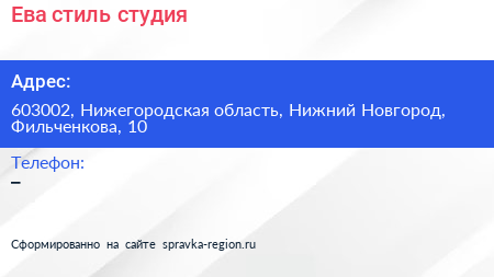 Ева, стиль-студия по адресу 603002, Нижегородская область, Нижний Новгород, Фильченкова, 10 в дальнейшем Организация, размещена в следующих категориях:
