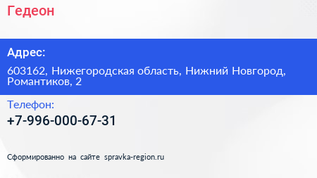 Гедеон по адресу 603162, Нижегородская область, Нижний Новгород, Романтиков, 2 в дальнейшем Организация, размещена в следующих категориях: