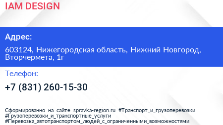 IAM DESIGN по адресу 603124, Нижегородская область, Нижний Новгород, Вторчермета, 1г в дальнейшем Организация, размещена в следующих категориях: