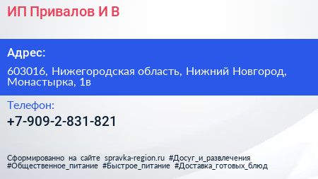 ИП Привалов И.В. по адресу 603016, Нижегородская область, Нижний Новгород, Монастырка, 1в в дальнейшем Организация, размещена в следующих категориях: