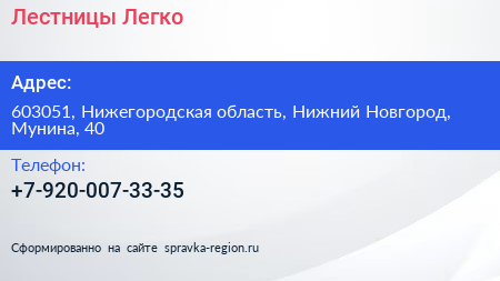 Лестницы Легко по адресу 603051, Нижегородская область, Нижний Новгород, Мунина, 40 в дальнейшем Организация, размещена в следующих категориях: