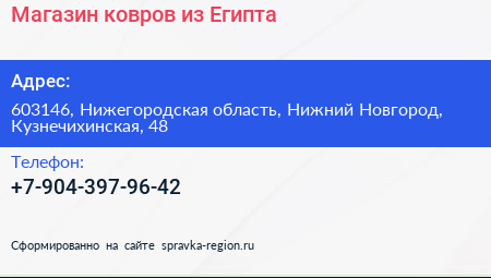 Магазин ковров из Египта по адресу 603146, Нижегородская область, Нижний Новгород, Кузнечихинская, 48 в дальнейшем Организация, размещена в следующих категориях: