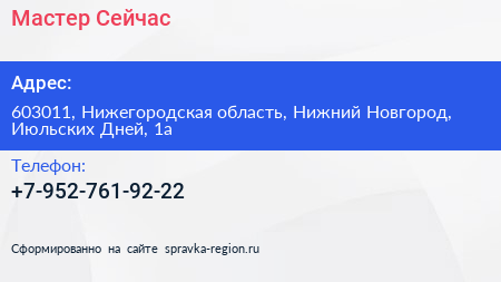 Мастер Сейчас по адресу 603011, Нижегородская область, Нижний Новгород, Июльских Дней, 1а в дальнейшем Организация, размещена в следующих категориях:
