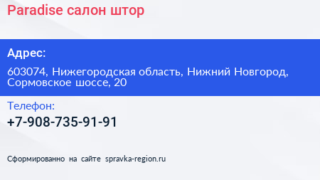 Paradise, салон штор по адресу 603074, Нижегородская область, Нижний Новгород, Сормовское шоссе, 20 в дальнейшем Организация, размещена в следующих категориях: