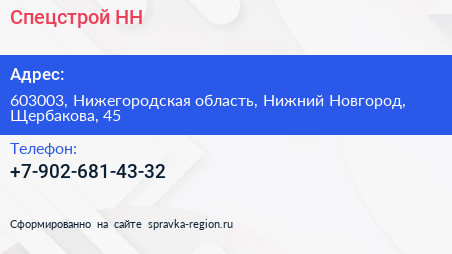 Спецстрой-НН по адресу 603003, Нижегородская область, Нижний Новгород, Щербакова, 45 в дальнейшем Организация, размещена в следующих категориях: