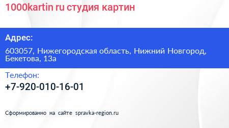 1000kartin.ru, студия картин по адресу 603057, Нижегородская область, Нижний Новгород, Бекетова, 13а в дальнейшем Организация, размещена в следующих категориях: