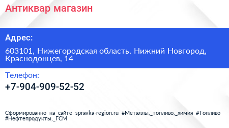 Антиквар, магазин по адресу 603101, Нижегородская область, Нижний Новгород, Краснодонцев, 14 в дальнейшем Организация, размещена в следующих категориях: