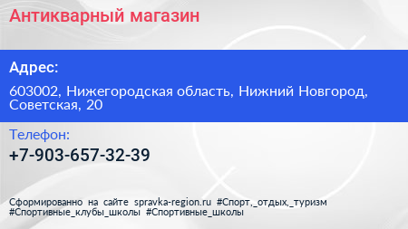 Антикварный магазин по адресу 603002, Нижегородская область, Нижний Новгород, Советская, 20 в дальнейшем Организация, размещена в следующих категориях: