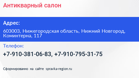 Антикварный салон по адресу 603003, Нижегородская область, Нижний Новгород, Коминтерна, 117 в дальнейшем Организация, размещена в следующих категориях:
