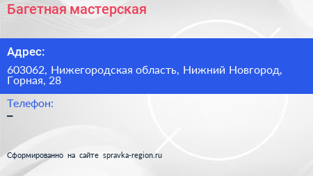 Багетная мастерская по адресу 603062, Нижегородская область, Нижний Новгород, Горная, 28 в дальнейшем Организация, размещена в следующих категориях: