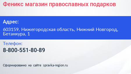 Феникс, магазин православных подарков по адресу 603159, Нижегородская область, Нижний Новгород, Бетанкура, 1 в дальнейшем Организация, размещена в следующих категориях:
