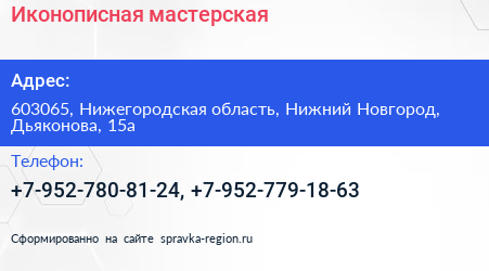 Иконописная мастерская по адресу 603065, Нижегородская область, Нижний Новгород, Дьяконова, 15а в дальнейшем Организация, размещена в следующих категориях: