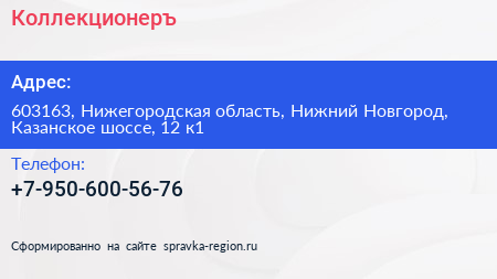 Коллекционеръ по адресу 603163, Нижегородская область, Нижний Новгород, Казанское шоссе, 12 к1 в дальнейшем Организация, размещена в следующих категориях: