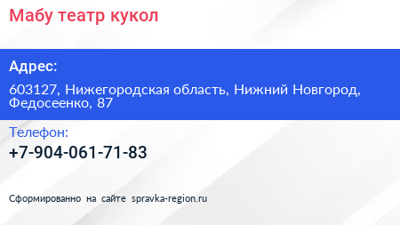 Мабу, театр кукол по адресу 603127, Нижегородская область, Нижний Новгород, Федосеенко, 87 в дальнейшем Организация, размещена в следующих категориях: