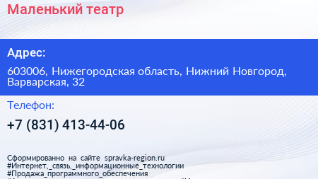 Маленький театр по адресу 603006, Нижегородская область, Нижний Новгород, Варварская, 32 в дальнейшем Организация, размещена в следующих категориях: