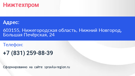 Нижтехпром по адресу 603155, Нижегородская область, Нижний Новгород, Большая Печёрская, 24 в дальнейшем Организация, размещена в следующих категориях: