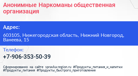 Анонимные Наркоманы, общественная организация по адресу 603105, Нижегородская область, Нижний Новгород, Ванеева, 15 в дальнейшем Организация, размещена в следующих категориях:
