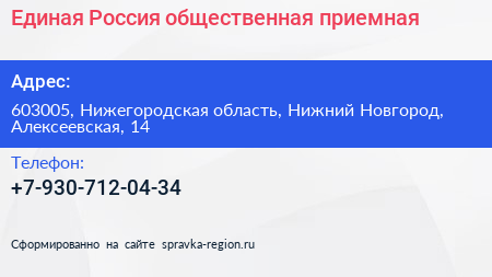 Единая Россия, общественная приемная по адресу 603005, Нижегородская область, Нижний Новгород, Алексеевская, 14 в дальнейшем Организация, размещена в следующих категориях: