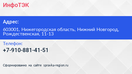 ИнфоТЭК по адресу 603001, Нижегородская область, Нижний Новгород, Рождественская, 11-13 в дальнейшем Организация, размещена в следующих категориях: