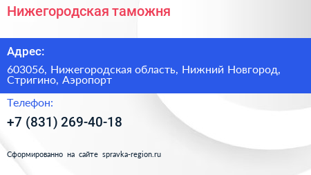 Нижегородская таможня по адресу 603056, Нижегородская область, Нижний Новгород, Стригино, Аэропорт в дальнейшем Организация, размещена в следующих категориях: