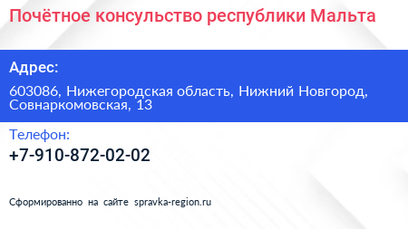 Почётное консульство республики Мальта по адресу 603086, Нижегородская область, Нижний Новгород, Совнаркомовская, 13 в дальнейшем Организация, размещена в следующих категориях: