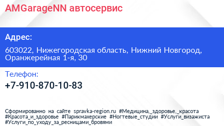 AMGarageNN, автосервис по адресу 603022, Нижегородская область, Нижний Новгород, Оранжерейная 1-я, 30 в дальнейшем Организация, размещена в следующих категориях: