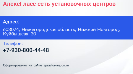 АлексГласс, сеть установочных центров по адресу 603074, Нижегородская область, Нижний Новгород, Куйбышева, 30 в дальнейшем Организация, размещена в следующих категориях: