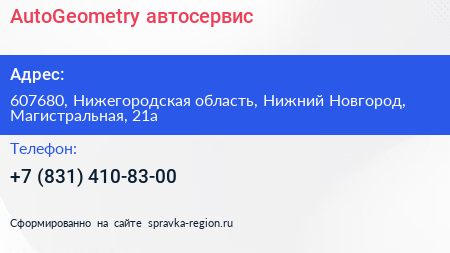 AutoGeometry, автосервис по адресу 607680, Нижегородская область, Нижний Новгород, Магистральная, 21а в дальнейшем Организация, размещена в следующих категориях: