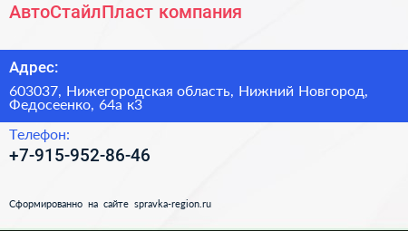 АвтоСтайлПласт, компания по адресу 603037, Нижегородская область, Нижний Новгород, Федосеенко, 64а к3 в дальнейшем Организация, размещена в следующих категориях: