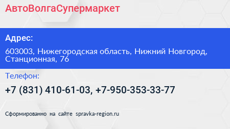 АвтоВолгаСупермаркет по адресу 603003, Нижегородская область, Нижний Новгород, Станционная, 76 в дальнейшем Организация, размещена в следующих категориях: