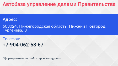 Автобаза управление делами Правительства по адресу 603024, Нижегородская область, Нижний Новгород, Тургенева, 3 в дальнейшем Организация, размещена в следующих категориях: