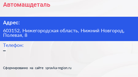 Автомашдеталь по адресу 603152, Нижегородская область, Нижний Новгород, Полевая, 8 в дальнейшем Организация, размещена в следующих категориях: