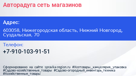 Авторадуга, сеть магазинов по адресу 603058, Нижегородская область, Нижний Новгород, Суздальская, 70 в дальнейшем Организация, размещена в следующих категориях: